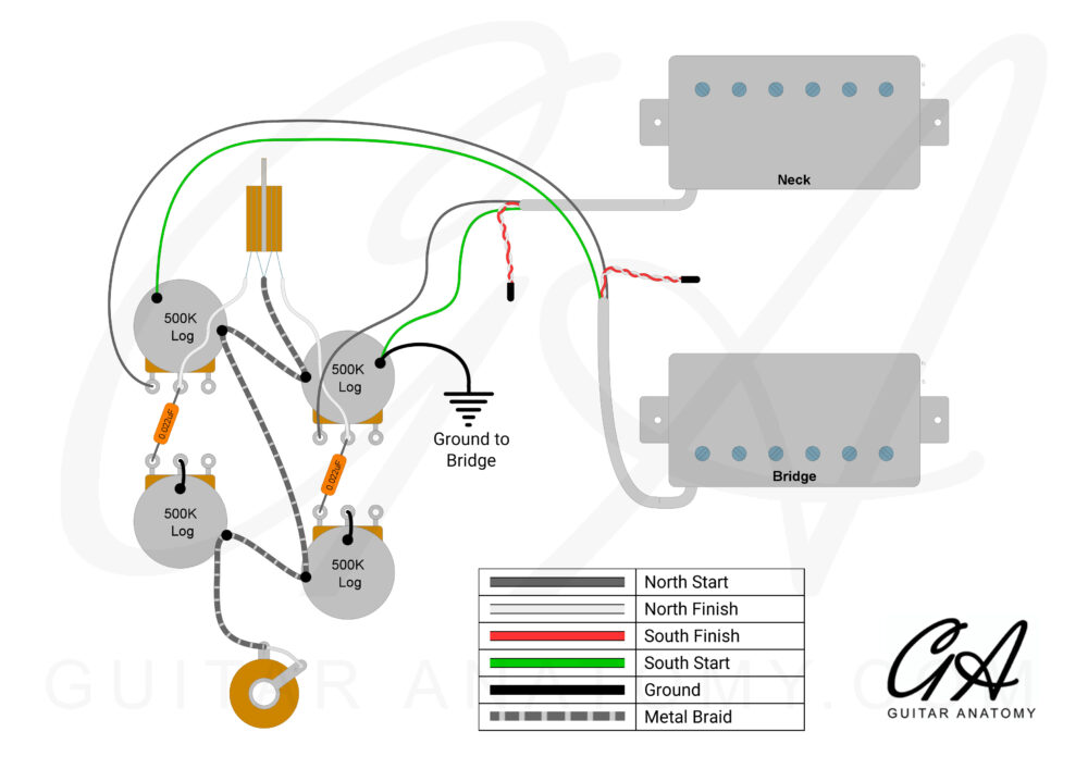 The Guitar Anatomy SG Wiring Kit – Pro retains the familiar modern wiring configuration while upgrading the core electronics for enhanced durability and professional-grade performance.